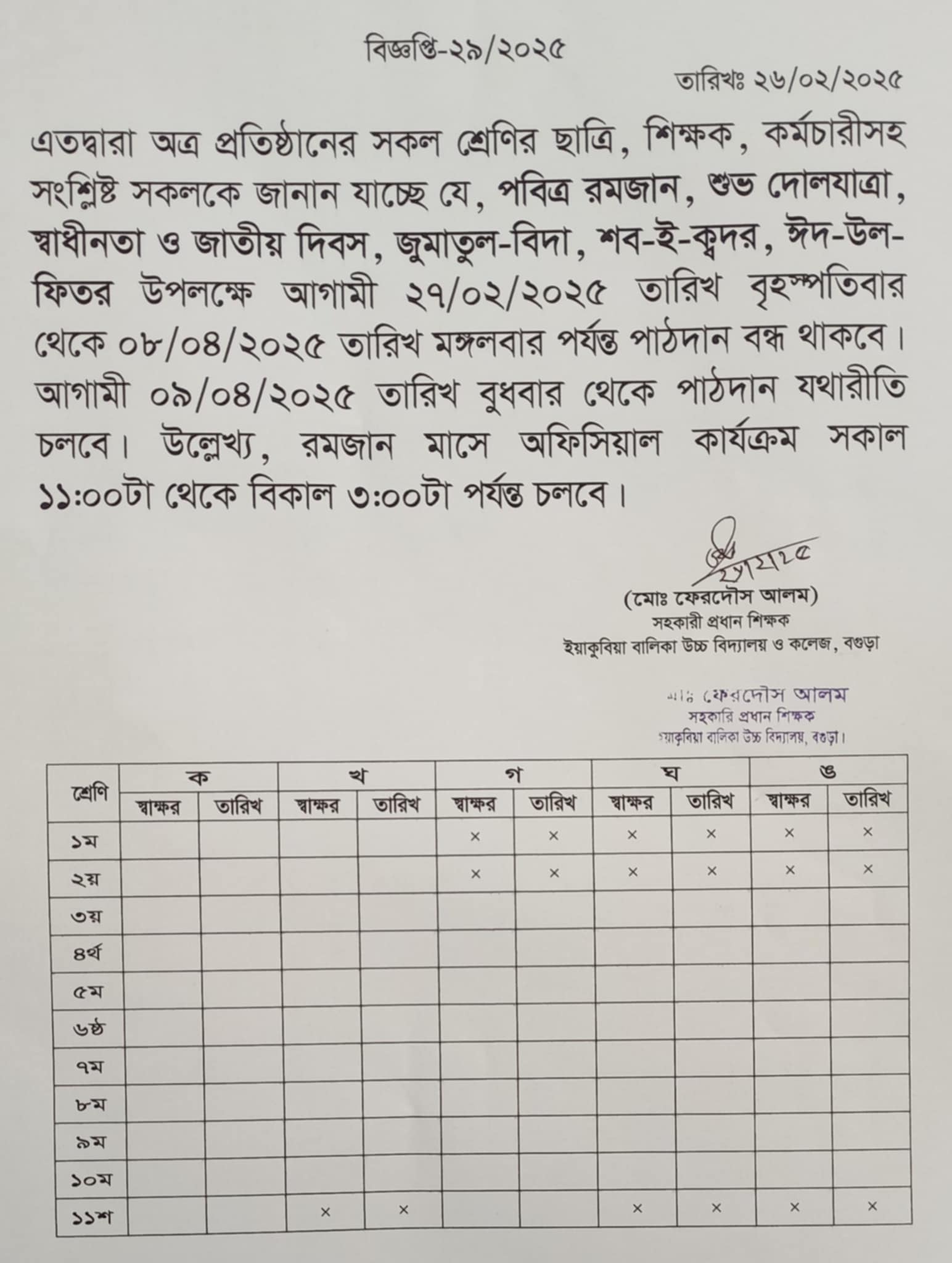 ২১২ 2025-02-26 রমজান, বিভিন্ন দিবস ও ঈদ-উল-ফিতরের ছুটি