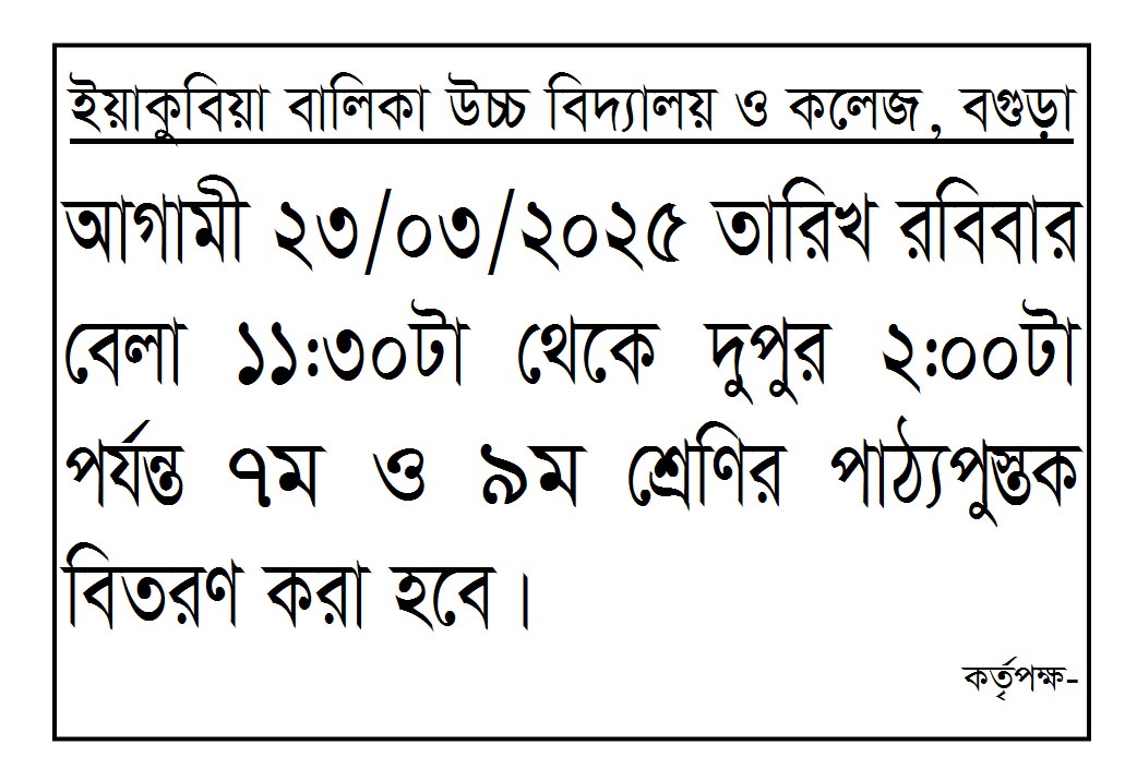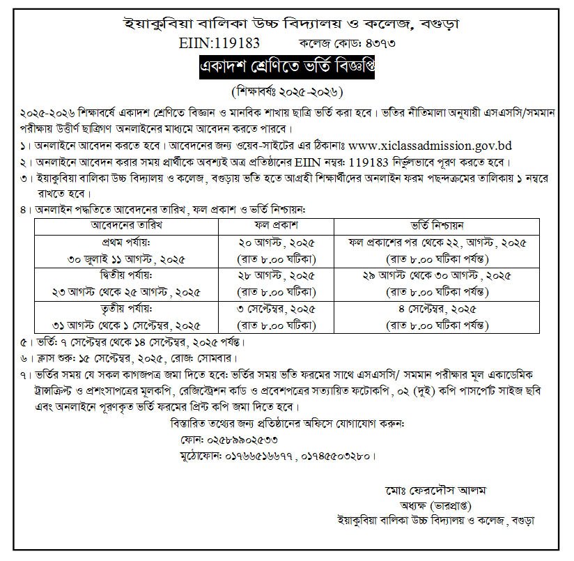 "ইয়াকুবিয়া বালিকা উচ্চ বিদ্যালয়ে ২০২৫ শিক্ষাবর্ষে সীমিত সংখ্যক শূন্য আসনে ১ম, ২য় ও ৩য় শ্রেণিতে ছাত্রি ভর্তি করা হবে। অনলাইনে (http://gsa.teletalk.com.bd) ভর্তি আবেদন করা যাবে। অনলাইনে আবেদন গ্রহণের প্রক্রিয়া ১২/১১/২০২৪ তারিখ সকাল ১১টা হতে শুরু হয়ে ৩০/১১/২০২৪ তারিখ বিকাল ৫টা পর্যন্ত চলমান থাকবে। " অধ্যক্ষ, ইয়াকুবিয়া বালিকা উচ্চ বিদ্যালয় ও কলেজ, বগুড়া। ,